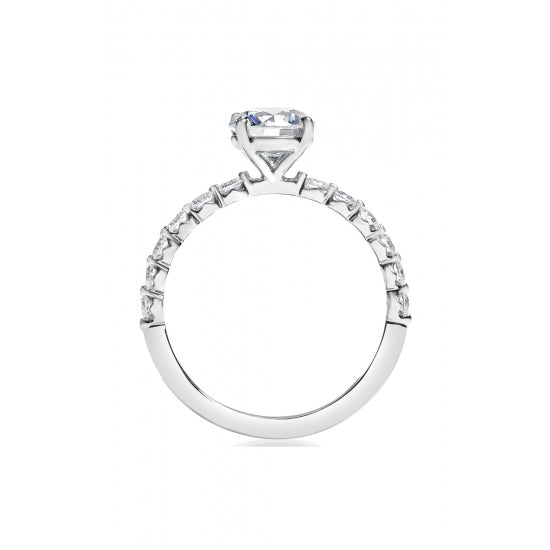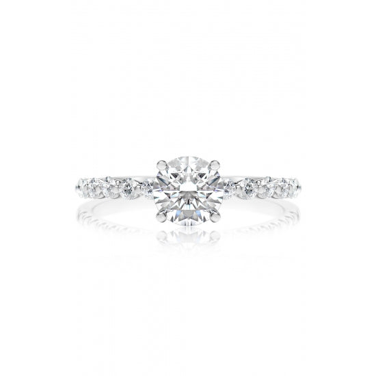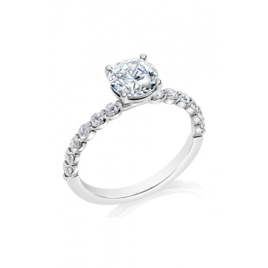 Gracefully detailed with half-way diamonds, this sidestone semi mounting frames your round center stone in a soft band of brilliance.