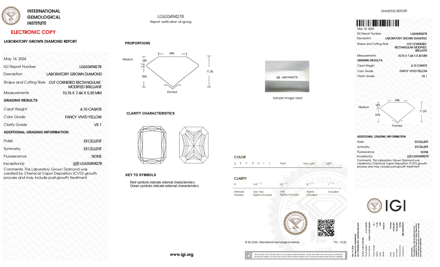 This IGI Certified 4.10-carat radiant brilliant fancy vivid yellow lab grown diamond is a masterpiece of color and light. With a rich golden hue and VS1 clarity, it glows with exceptional fire and intensity. Certified by IGI (No. 633494278), this extraordinary diamond merges precision with vivid brilliance — a statement piece for bespoke fine jewelry or a collector’s creation that embodies pure radiance.